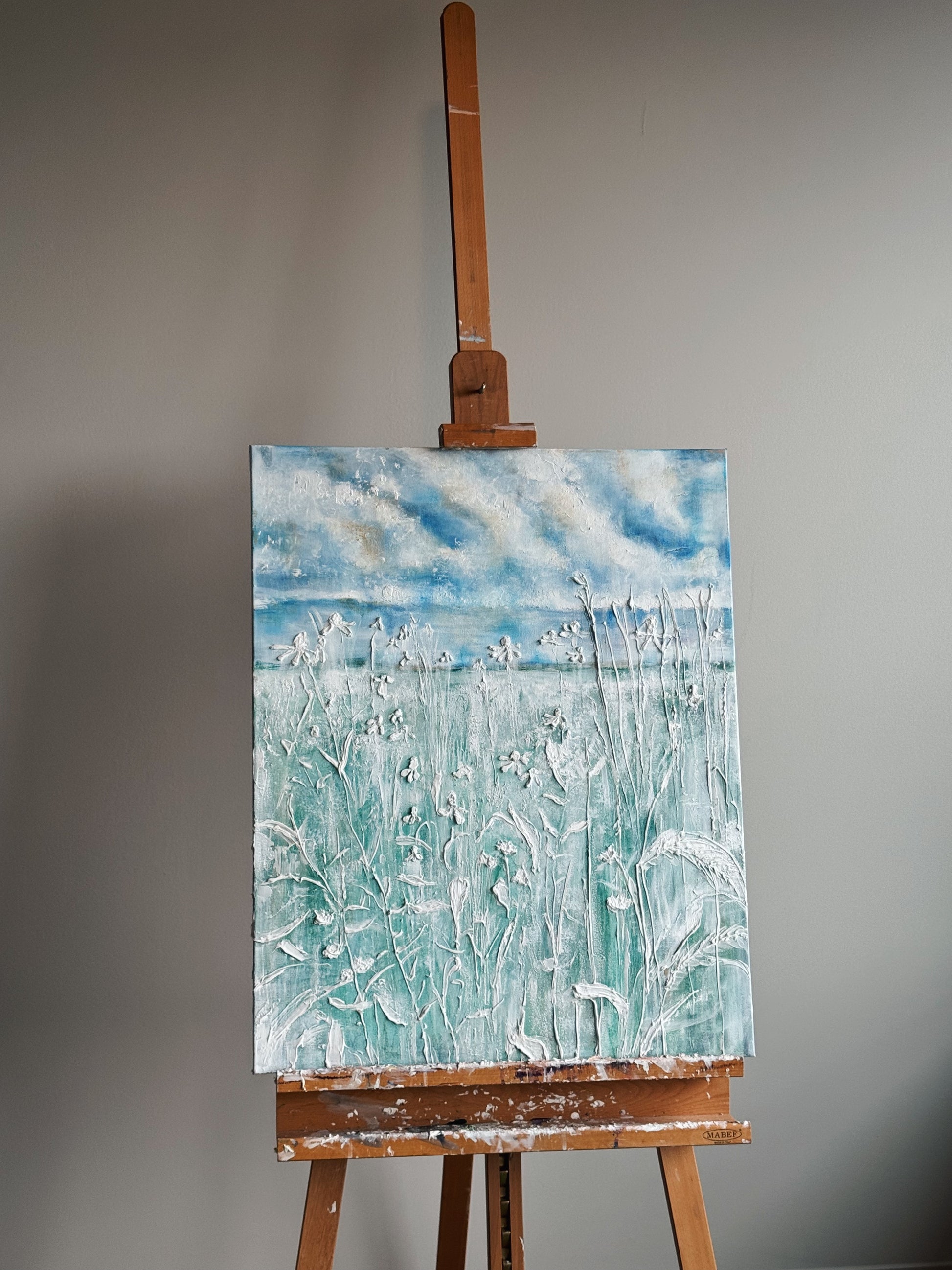 The painting begins with a blended pastel base, layered with gesso and acrylics for a light-and-shadow background. Textures form as modeling paste is applied with a palette knife and piping tube, creating intricate, raised details.