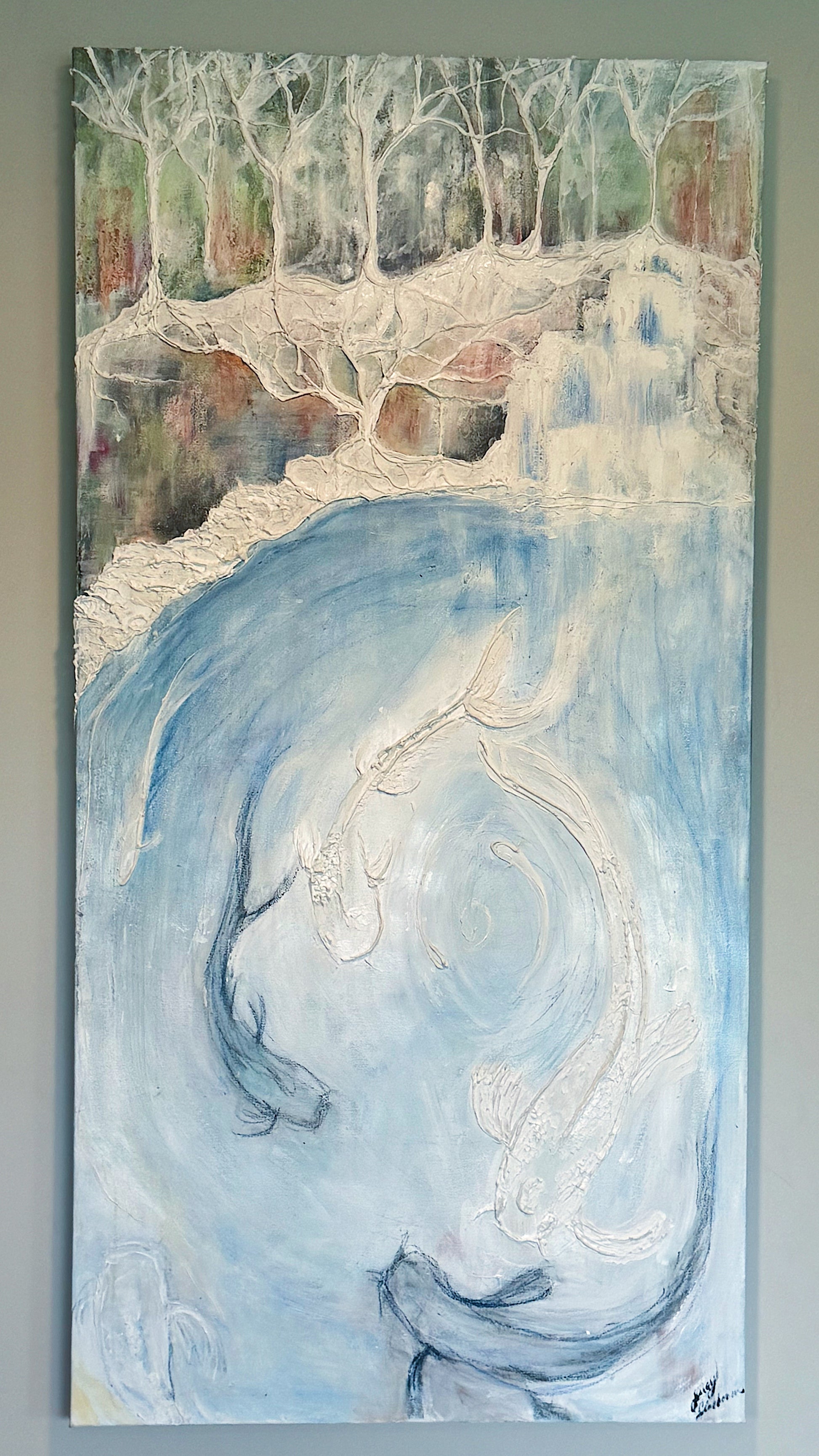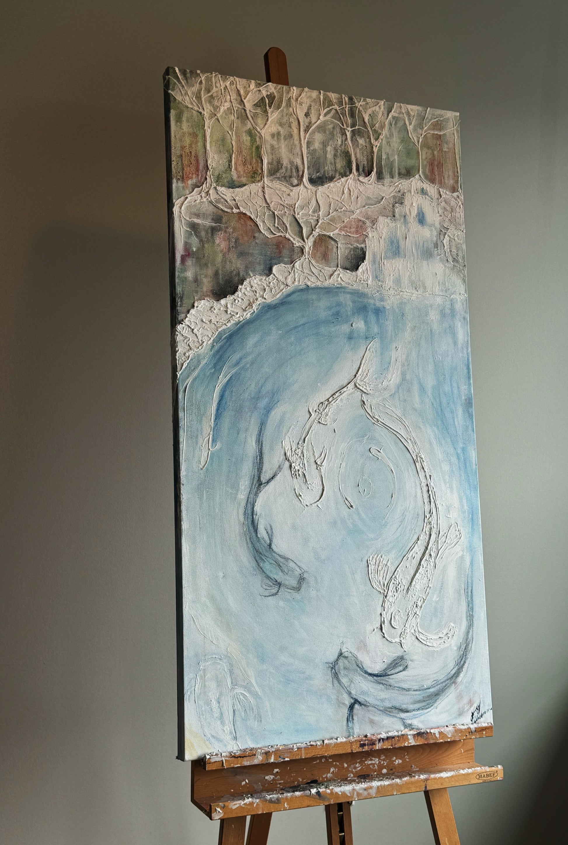 The painting begins with a blended pastel base, layered with gesso and acrylics for a light-and-shadow background. Textures form as modeling paste is applied with a palette knife and piping tube, creating intricate, raised details.
